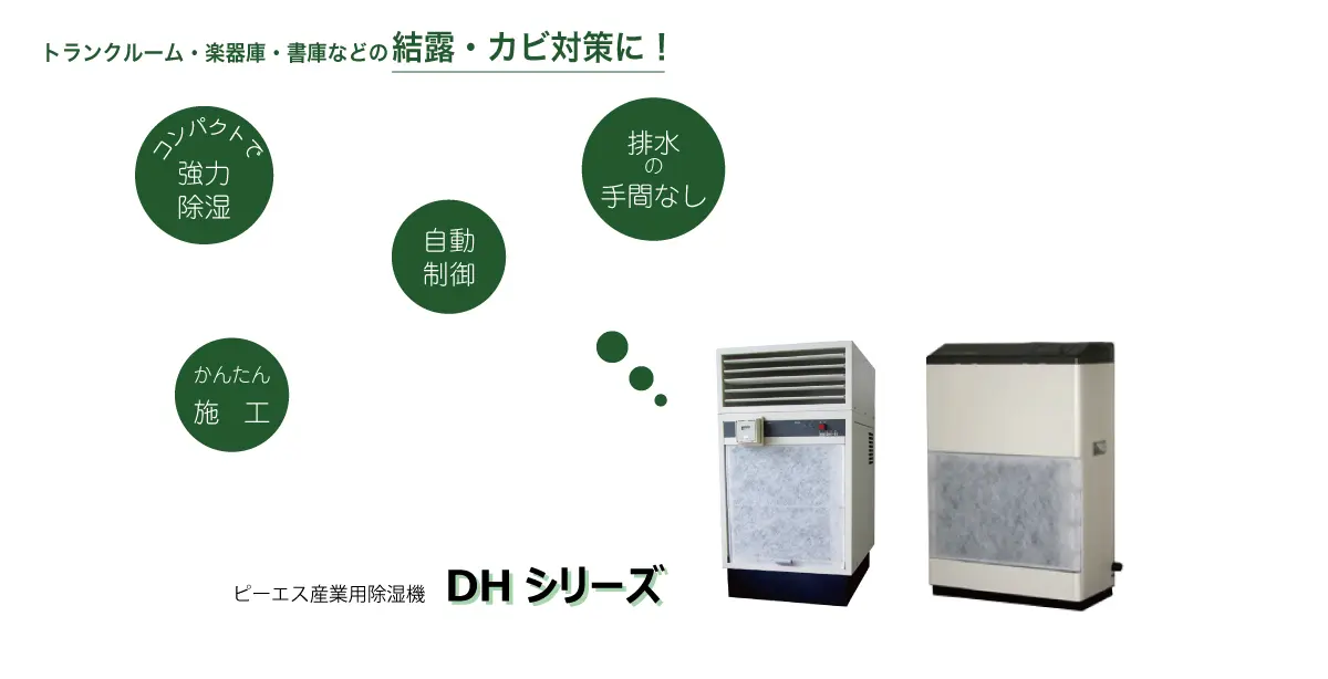 ピーエスの業務用加湿器DHシリーズは自動排水・自動制御で除湿に関する手間がかかりません。豊富なオプションで、排水配管の取りにくい箇所にも設置しやすく、用途に合わせた除湿プランがご提案できます。