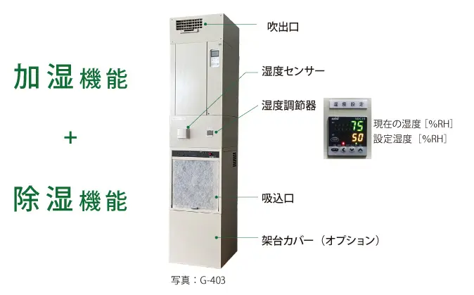 加湿器と除湿機が一体になったユニットG-153/G-403。設定した湿度に応じて、加湿・除湿を自動でコントロールします。